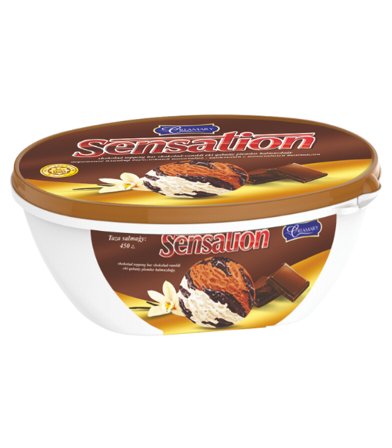 Главная МОРОЖЕННОЕ Семейное 1 кг. 0,5 кг. «Sensation» пломбир двухслойный шоколадно-ванильный с шоколадным топингом 450г