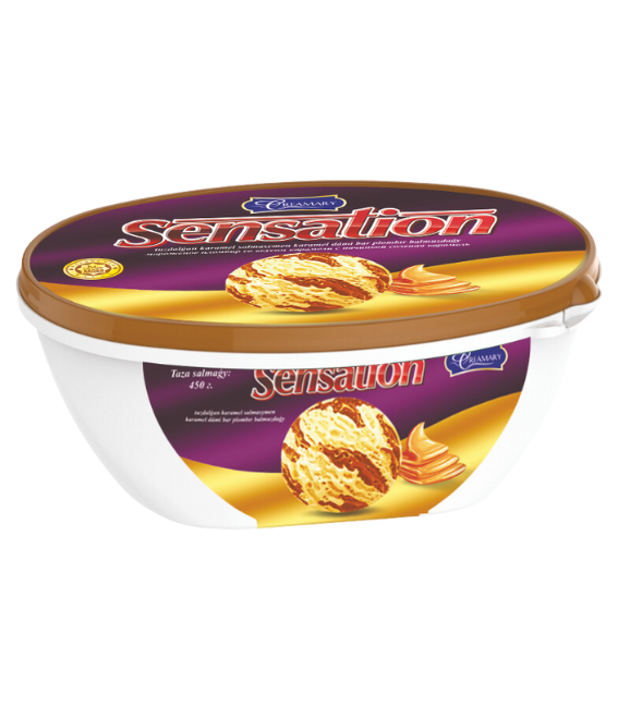 Главная МОРОЖЕННОЕ Семейное 1 кг. 0,5 кг. «Sensation» пломбир со вкусом карамели с начинкой соленая карамель 450г